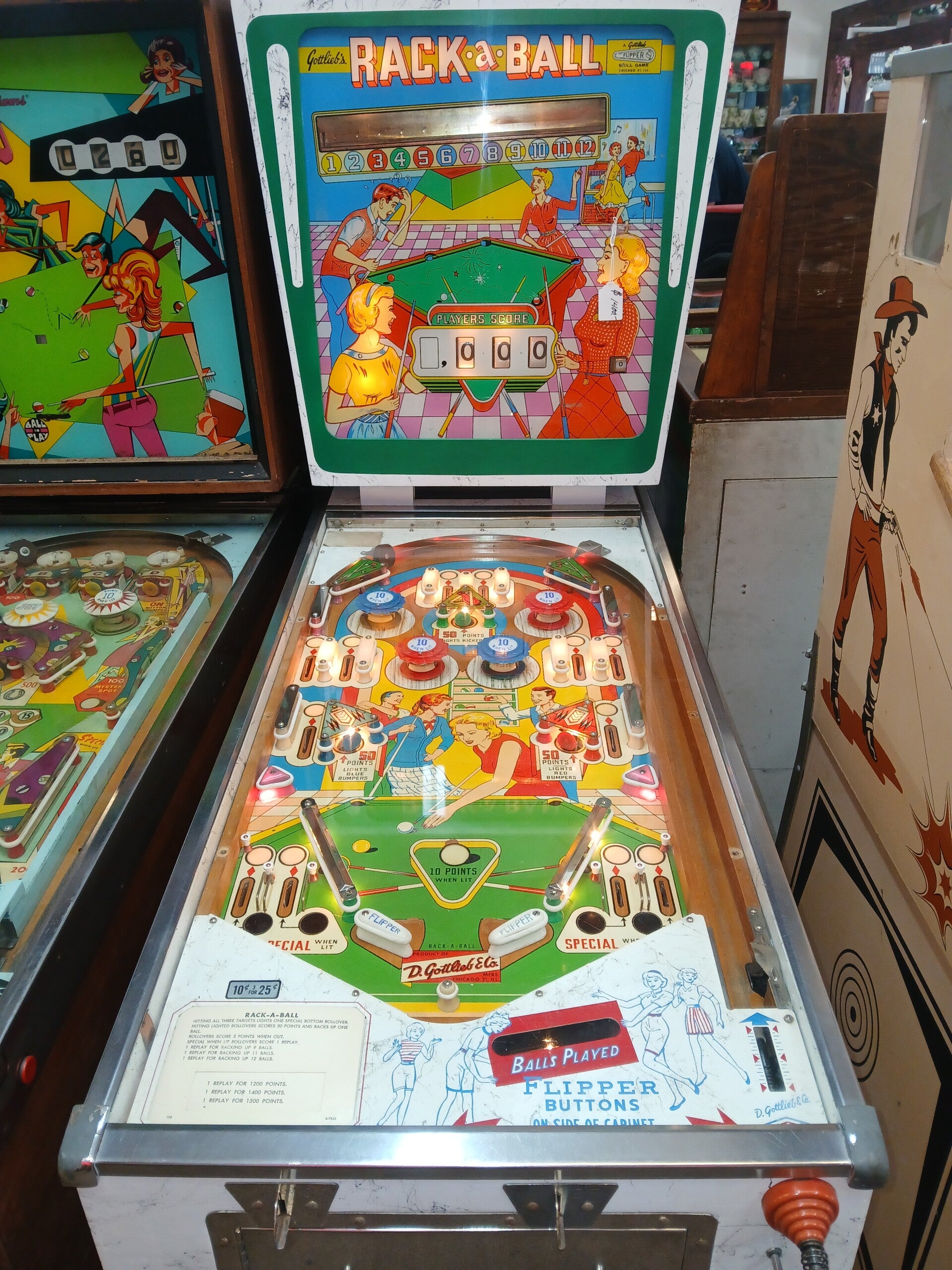 The Gottlieb Rack-A-Ball is a1962 elecro-mechanical pinball machine with a billiards theme. it's known for it's distinctive animated backglass that displays physical balls as players make shots on the playfield,and its objective is to "rack" all 12 billiards balls in order to win. Players hit rollover to advance the game, and hitting all three targets can light a special and earn a replay for racking nine balls.